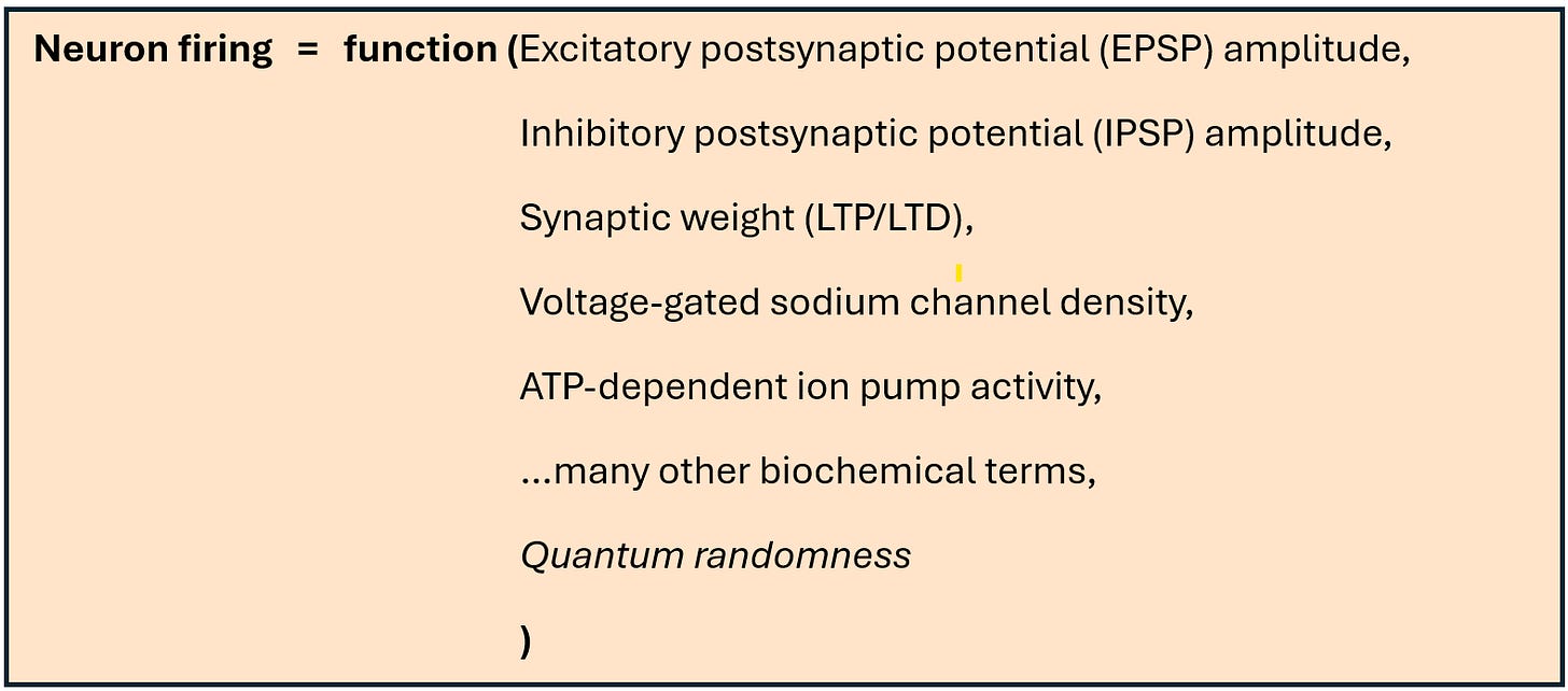 In this equation, each neuron’s firing is simply a function of different biochemical interactions, as well as including a variable for quantum randomness too. There is no additional variable that allows for ‘choice’ beyond the laws of physics doing their thing.