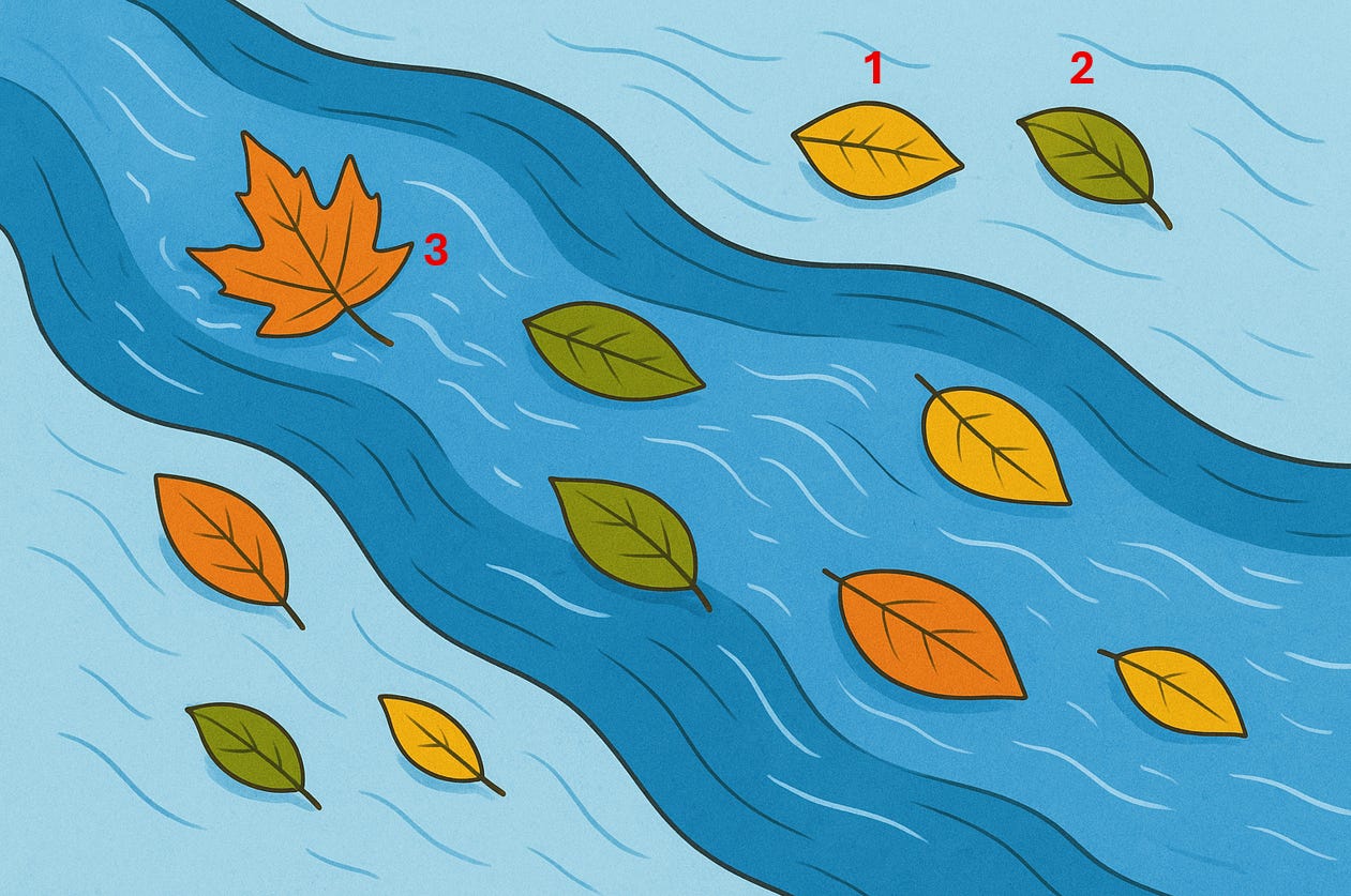 Like leaves floating down a stream, twisting and turning in the ebbs and flows of the current – we each follow our own paths, with absolutely NO say in them, despite feeling as though we do. Observing the image below, you will notice that leaves 1 and 2 are floating through calmer waters than leaf 3 for example. The leaves didn’t choose to be there, and they didn’t choose which part of the river they are in, but nonetheless they are there and bound for certain paths not of their choosing. It has taken time for me to realise it but we humans are no different. Some of us are gifted things like high intelligence, good looks, wealth, a loving family and good health. These all influence how our brain is formed and how it remoulds over time. As your brain creates your entire reality, it will therefore dictate the kind of life you have, and invevitably, the degree of challenge you experience.